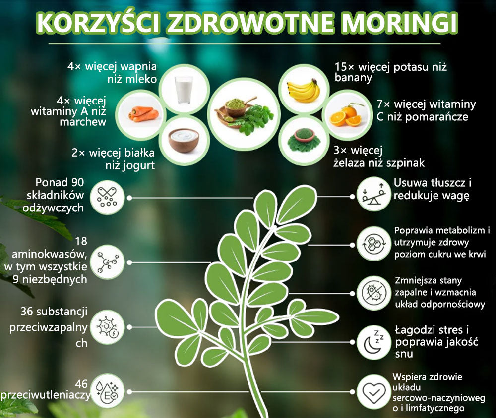 Moringa: Moringa to naturalna elektrownia odżywcza, która wspomaga kontrolę masy ciała i ogólny stan zdrowia. Zawiera białko i wszystkie niezbędne aminokwasy, co czyni ją doskonałym źródłem białka roślinnego. Bogata w witaminy A, C i E, pomaga poprawić wzrok, odporność i produkcję kolagenu. Dostarcza również wapń, żelazo i potas, aby wspierać zdrowie kości i serca. Jej przeciwutleniacze zmniejszają stany zapalne, a błonnik pomaga w trawieniu i regulacji poziomu cukru we krwi. Ponadto Moringa wspomaga produkcję GLP-1, pomagając ograniczyć głód i wspierając kontrolę masy ciała.
