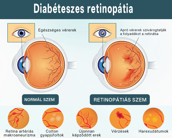 Diabéteszes retinopátia: A kontrollálatlan vércukorszint károsítja a retina apró ereit, ami szivárgáshoz, vérzéshez és rendellenes új erek kialakulásához vezet – ami visszafordíthatatlan látásvesztést okoz.