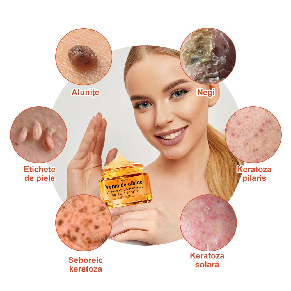 Crema PieleViu™ Venin de albine Cremă pentru tratamentul alunitelor şi negilor utilizează proprietățile puternice ale veninului de albine pentru a trata eficient diverse probleme ale pielii, inclusiv semnele pe piele, alunițele, negii și petele. Această formulă avansată conține ingrediente active extrase din veninul de albine, capabile să descompună și să îndepărteze cu delicatețe creșterile nedorite.